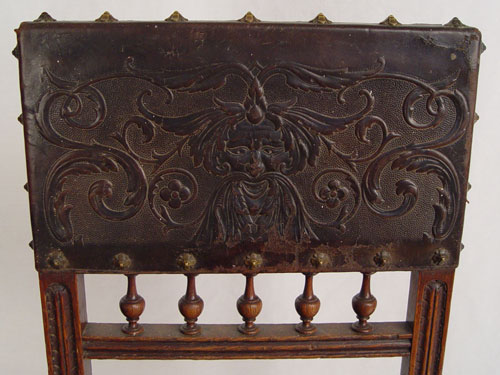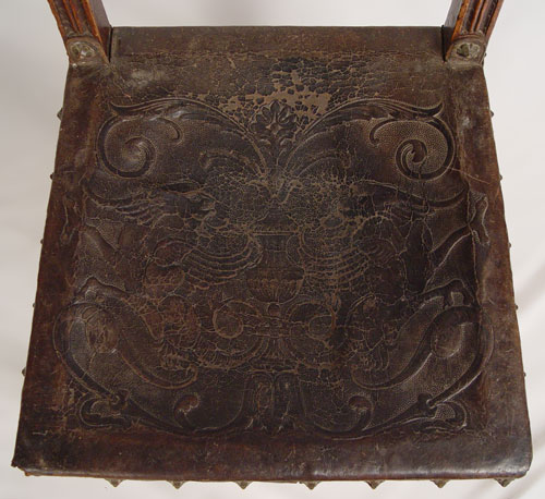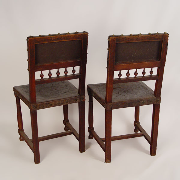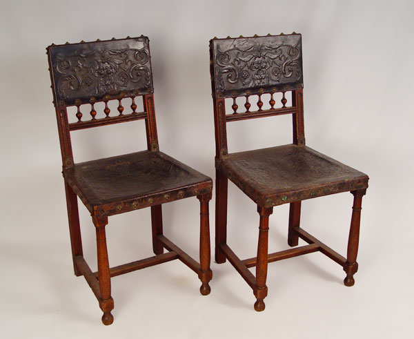 2 EARLY SPANISH CARVED AND LEATHER BOUND CHAIRS: 35'' high x 17'' wide x 18'' deep