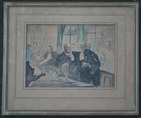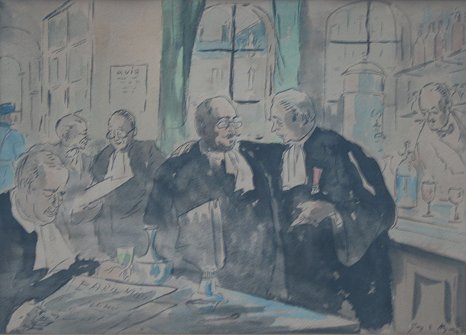 NEYRAC, Guy de, (French, 1900-1950): ''Le Bourett au Palais du Justice'', depicts French legal officials having a discussion in a bistro, W/C, 9 1/2'' x 13 1/2'' sight size, signed, titled verso, framed, 17 1/4'' x 21''.
