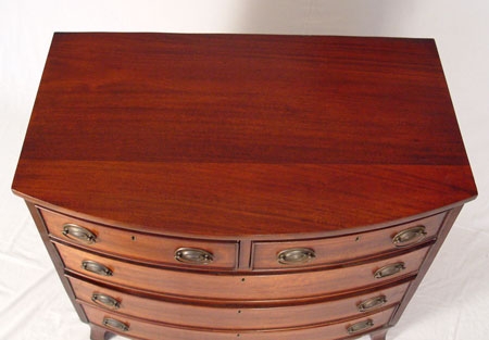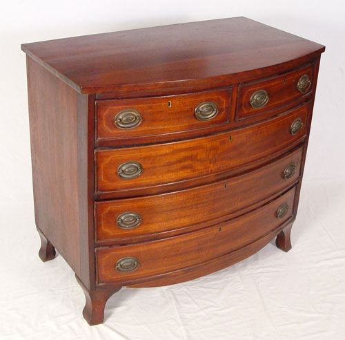 MAHOGANY HEPPLEWHITE STYLE BOWFRONT CHEST: 2 drawers over 3 full length drawers. Each drawer with string inlay and framed in molding. Measures 34 1/2'' high x 37 3/4'' wide x 22'' deep.