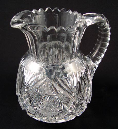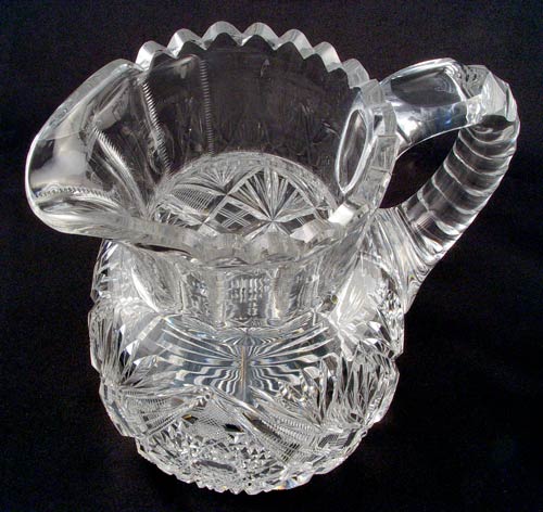 SIGNED LIBBEY CUT GLASS PITCHER: American Brilliant period cut glass pitcher, Measures 8'' high. Please note small chips underside only.
