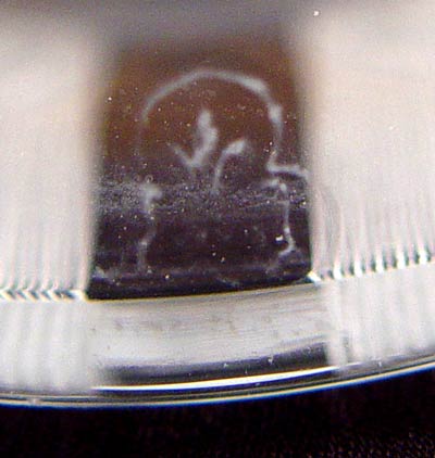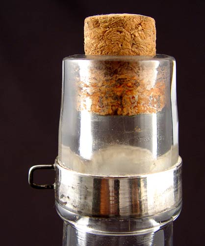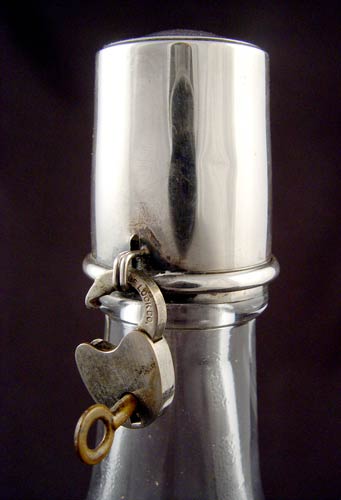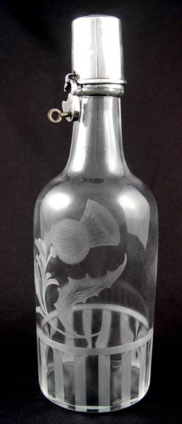 SIGNED HAWKES THISTLE DESIGN CUT GLASS DECANTER: Etched design with thistle. Sterling topper/tumbler with lock and key. Measures 11'' high.