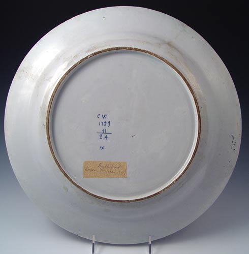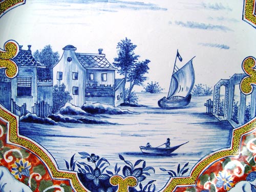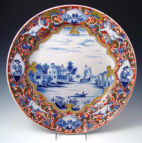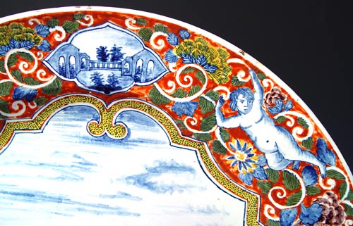 FRENCH FAIENCE CHARGER attrib. to ROUEN FRANCE: With the signature yellow ribbon framing the hand painted interior. 16'' dia.