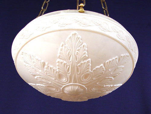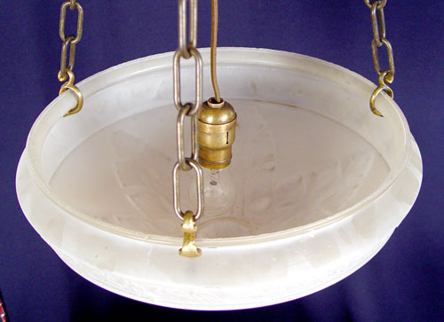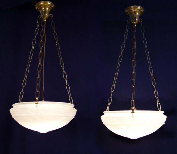 PAIR ART DECO GLASS HANGING LAMPS: Single socket hangs from top. Frosted glass. Measures 30 1/4'' high x 15'' shade dia.