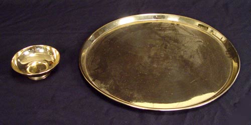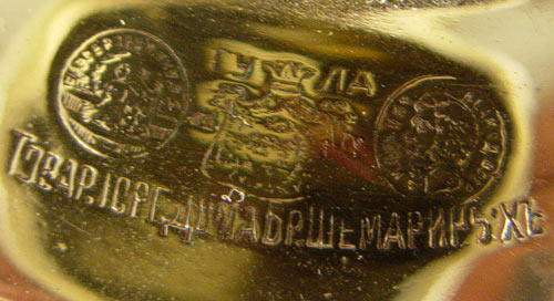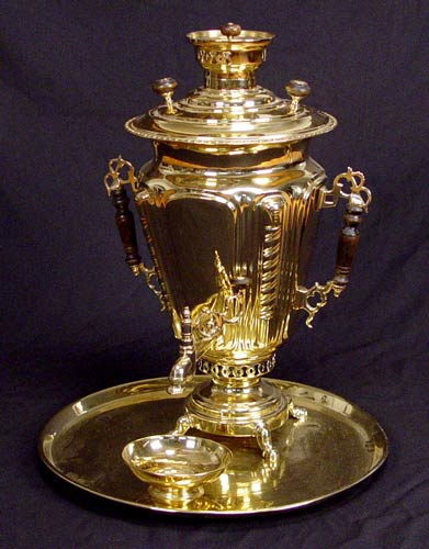 RUSSIAN SAMOVAR: Early Russian inscription. Sold with 18.5'' tray and drip bowl. Measures 22 1/4'' high x 14'' wide at handles. Ebony wood handles, newly plated.