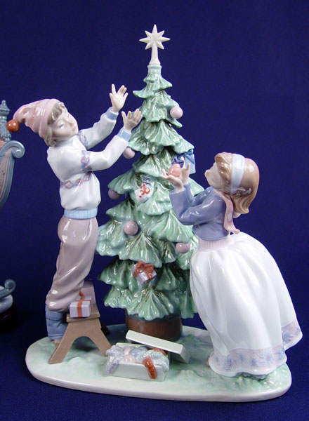 LLADRO PORCELAIN TRIMMING THE TREE 5897: Figural group children and tree, 12''h.