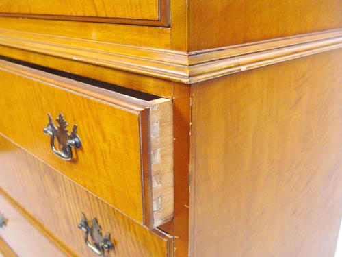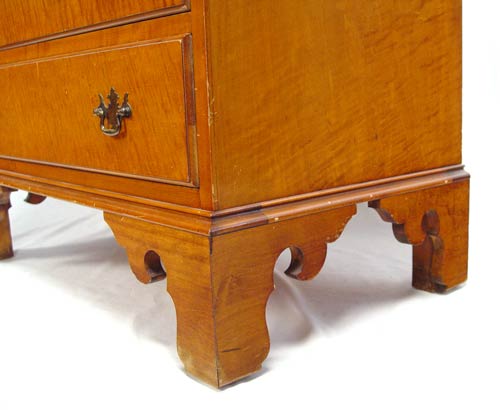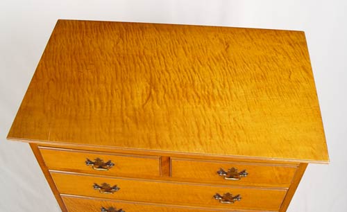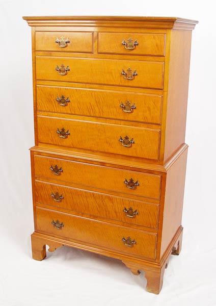 TIGER MAPLE TALL CHEST ON CHEST: Mid 20th C. 8 drawer tall chest, 54 1/2'' high x 30 1/2'' wide x 18 1/4'' deep.