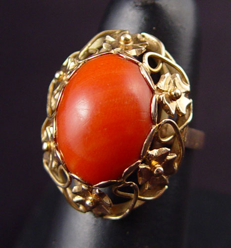 FILIGREE RED CORAL AND 18K GOLD RING: 18K yellow gold and coral ring with one oval shaped cabochon cut piece of red coral, 15.00 x 12. 00 mm. Coral is slightly abraded. Weight: 7.2 grams. Size 5 1/2