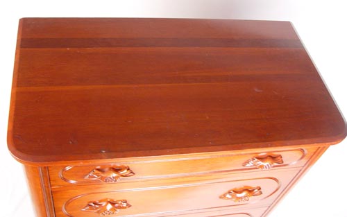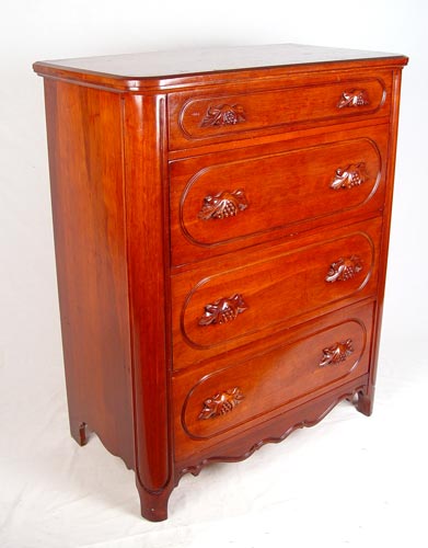 DAVIS CABINET CO LILLIAN RUSSEL CHERRY CHEST: 4 drawer cherry chest with berry and leaf carved pulls. Original Davis Cabinet Co. label. Davis Cabinet Co of Nashville, TN. Measures 46 1/2'' high x 37 1/2'' wide x 30 1/2'' deep.
