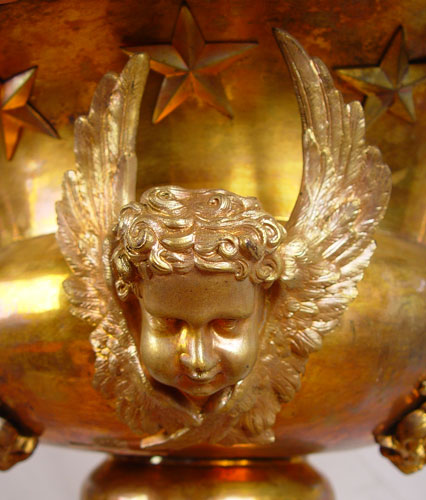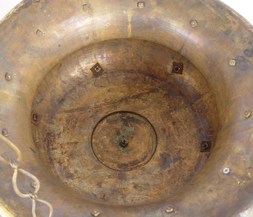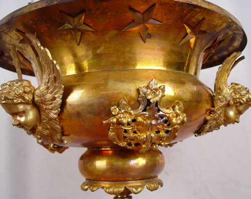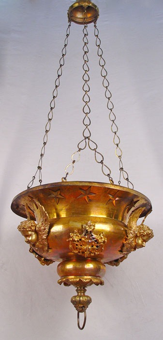 19th C CONTINENTAL ANGELIC HANGING INCENSE BURNER: Bowl form, hangs from 3 chains. Approx. 23'' dia., hangs 54''.