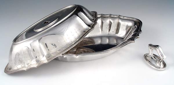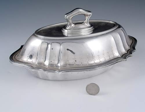 MARCUS & CO. STERLING COVERED VEGETABLE DISH: Covered vegetable serving dish with engraved floral design on top and bottom. Marked Marcus & Co. New York Sterling 4464. No monogram. Measures 5 1/4'' high x 11 3/4'' wide. Approx. 30.1 troy oz.