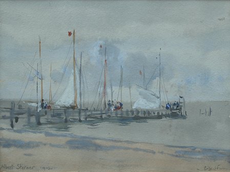 STERNER, Albert, (American, 1863-1946): ''Edgartown Pier, Martha's Vineyard'', W/C heightened with white, 5'' x 6 3/4'', signed and dated 1912, titled lower right, framed, 10'' x 12'', Davis Galleries label verso. From the collection of Don Page.