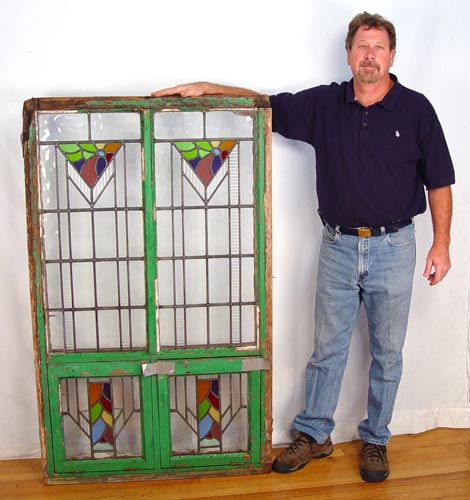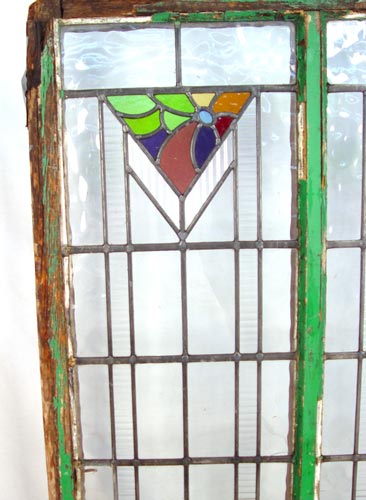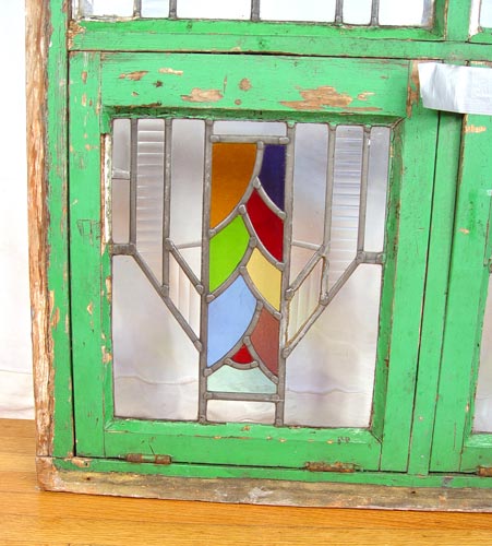 LARGE 4 PANEL STAINED GLASS WINDOW: 4 panels, 2 open for ventilation. Reputedly from a church in England. Measures 61'' x 37''. Please note condition of wood.