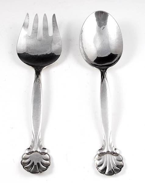 GEORG JENSEN SHELL #102 STERLING SALAD SET: 2 pieces with shell design to include serving fork (9 3/4'') and serving spoon (9 3/4''). Marked Georg Jensen Denmark Sterling 102. Approx. 7.4 troy oz.