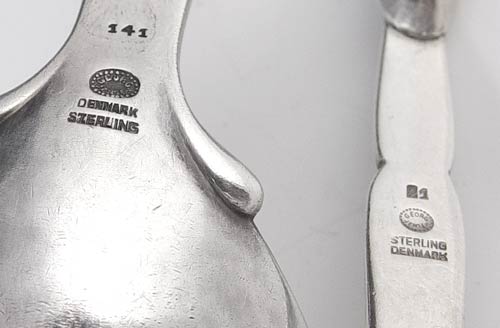 GEORG JENSEN #141 LEAF & BERRY SERVING & SPOON: To include serving spoon marked Georg Jensen Denmark Sterling 141. Measures 8''. Also includes dinner spoon marked same with 21, measures 5 3/8'' in length. Approx. 3.5 troy oz.