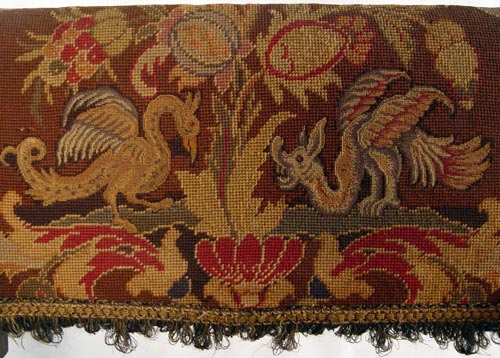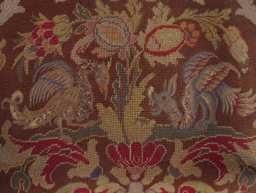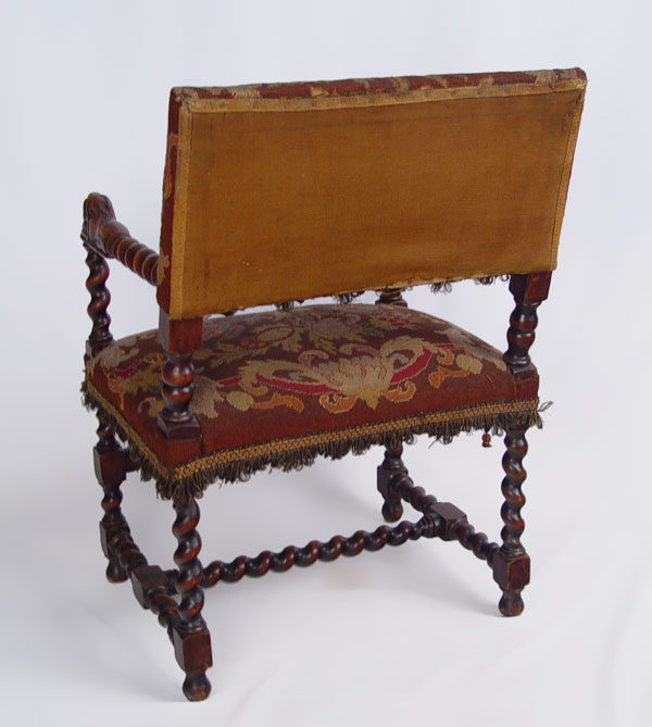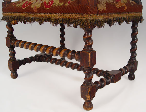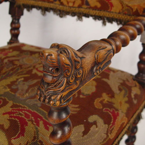 EARLY ENGLISH TWIST CARVED ARMCHAIR: Full body lion hand holds, twist arms, supports, legs and stretchers. Appears to be original needlepoint (with repairs to the seat). 34 1/2'' high x 22'' wide x 22 1/2'' deep