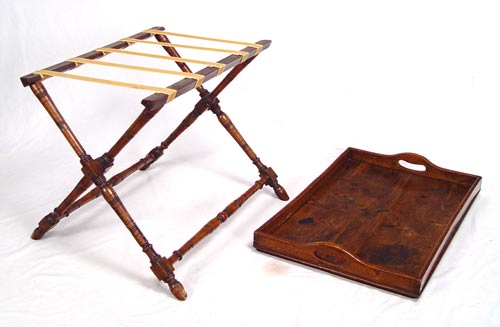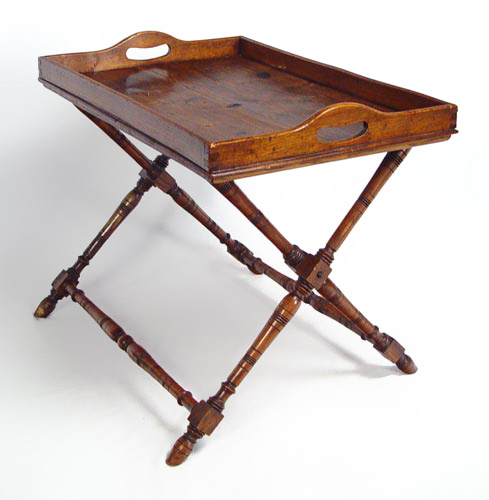 LATE 18TH - EARLY 19TH C. WALNUT BUTLERS TRAY ON STAND: Pierce handle tray and folding stand. Please note repaired split in tray. Tray measures 27 1/2'' x 19''.