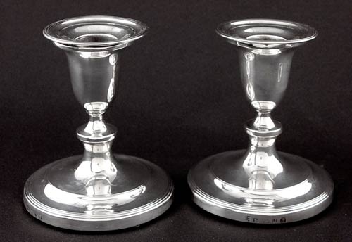 PAIR 1792 SHEFFIELD ENGLISH SILVER CANDLESTICKS: Pair with 1792 Sheffield hallmarks and SR GC & Co., Samuel Roberts, George Cadman & Co. makers hallmark. Bases weighted under green felt. Measures 4 3/8'' tall.