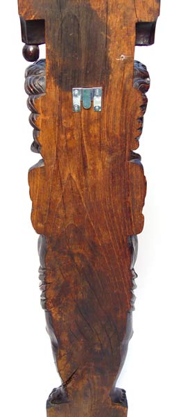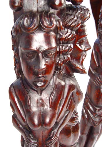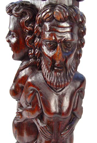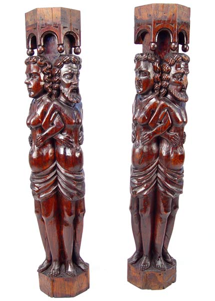 PAIR CARVED FIGURAL ARCHITECTURAL OR FURNITURE PILASTERS: Matched pair, each with a man and woman with arms locked. Please note one with gents partial loss of nose and loss of ball finial. 43 1/4'' high x 8 1/4'' wide x 4 1/2'' deep