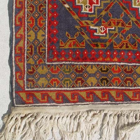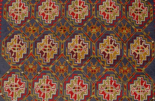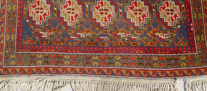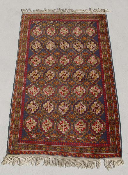 HAND TIED ORIENTAL CARPET IN REPEATING GEOMETRIC DESIGN: Blue field 6' 6'' x 4' 8''
