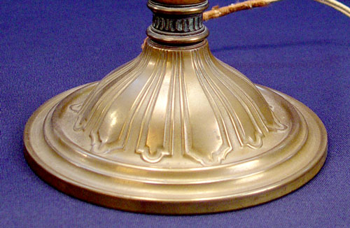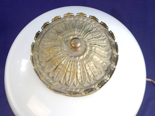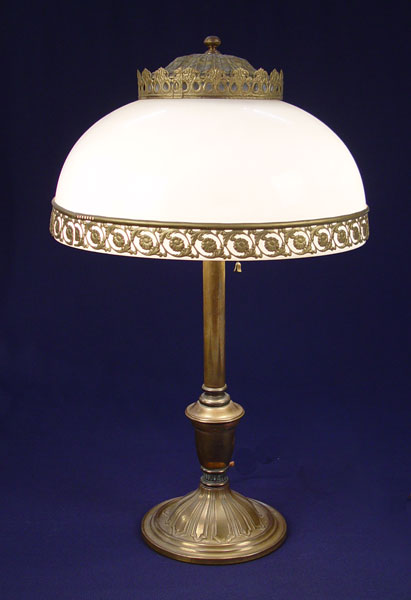 BRADLEY & HUBBARD TABLE LAMP: Brass base, body and large finial. White glass dome shade with removable brass border. 2 sockets. Measures 23 1/4'' high x 8'' base dia. 14'' shade dia. Attribution.