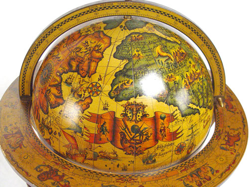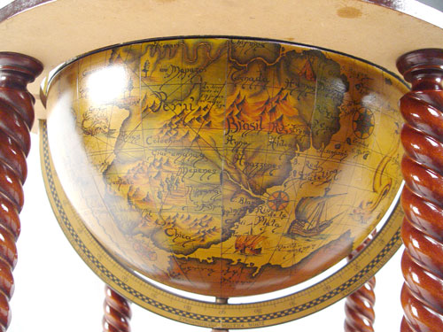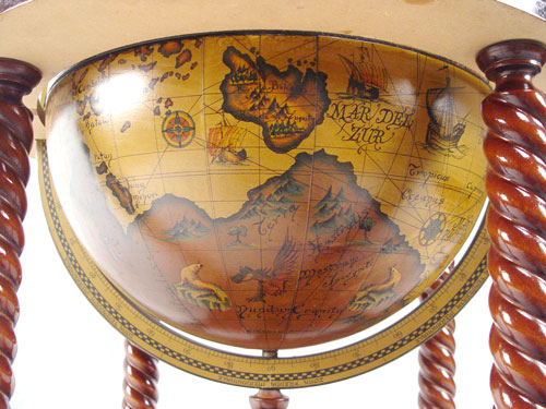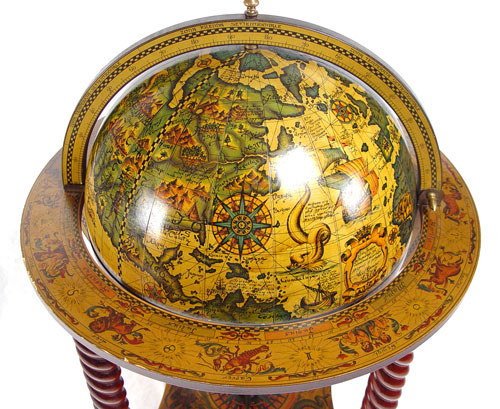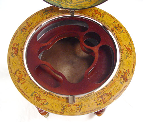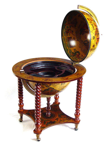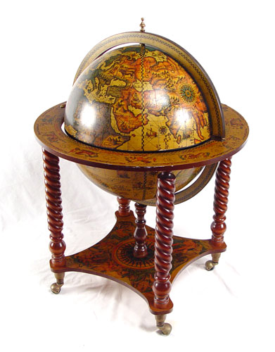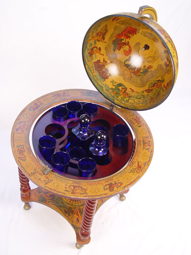FLOOR STANDING GLOBE BAR WITH COBALT GLASSWARE: Globe opens to reveal inner compartment for decanters, etc. Measures 39'' high x 27 1/2'' dia. Comes with cobalt blue glass bar set. 2 decanters 10'', 8 highball glasses 3 5/8'', tray 11 3/8'' dia.