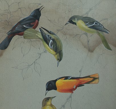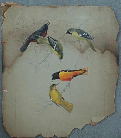 PETERSON, Roger Tory, (American, 1908-1996): Bird Studies Orioles, W/C & Gouache, 16 1/2'' x 13 1/2'', unsigned, unframed, 20'' x 17'' with margins. Missing some paper in the borders, water damage in upper portion.