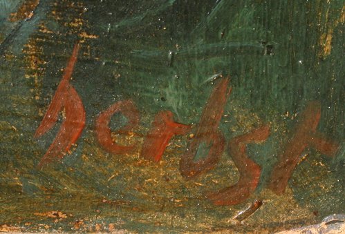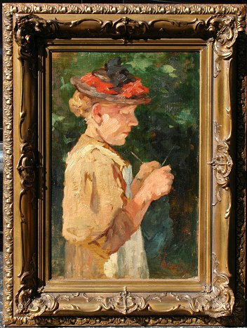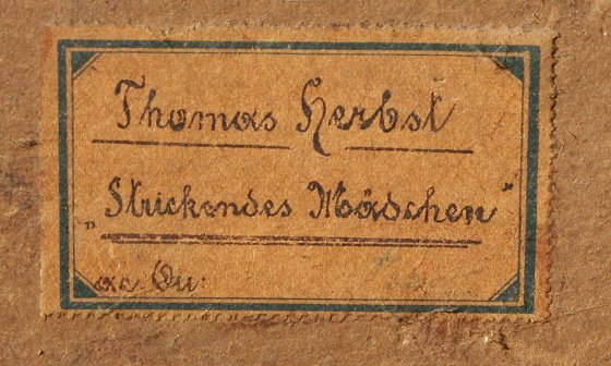 HERBST, Thomas, (German, 1848-1915): Portrait of Woman Knitting, OIL/B, 23'' x 15 1/4'', signed, titled verso, gilded and pierce carved frame, 32'' x 24''.