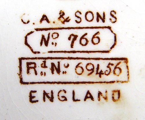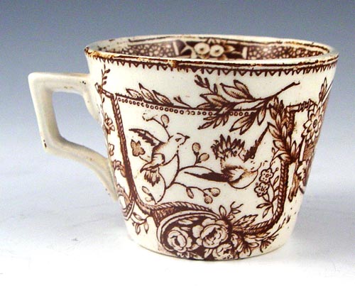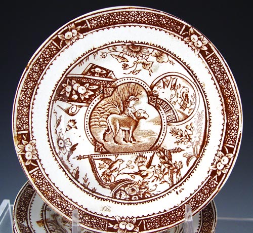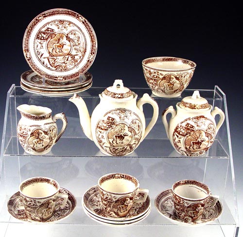 STAFFORDSHIRE CHILDS BROWN TRANSFERWARE TEA SET: English registry number indicates Ca. 1887. Includes 5'' teapot, covered sugar, cream pitcher, 5 plates (5 1/4'' dia.), 3 cups, 5 saucer bowls and a cereal bowl for the child.