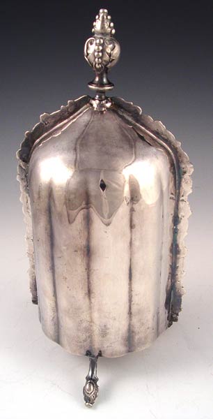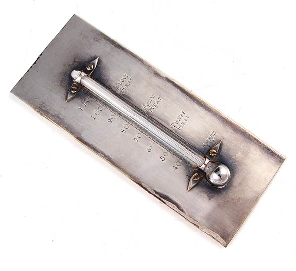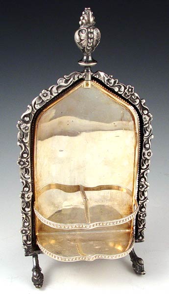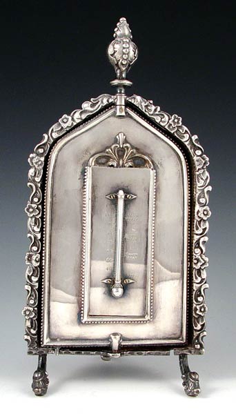 SILVERPLATED TABLE TOP THERMOMETER: Mercury reading with incised word, ''Blood Heat'', ''Summ Heat'', ''Temp Heat'', and ''Freezing''. Ornate stand, spin of the finial revolves the thermometer, reverse side appears to hold bottles?. 10 1/4''h. 5''w.