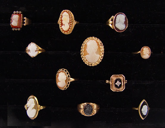 LOT OF 11 GOLD CAMEO RINGS: 6 rings are set in 14Km 5 are in 10K. Featuring a reversible onyx to cameo ring, a gents intaglio cut, and Victorian cameo with seed pearls. Sizes 4- 6.25.