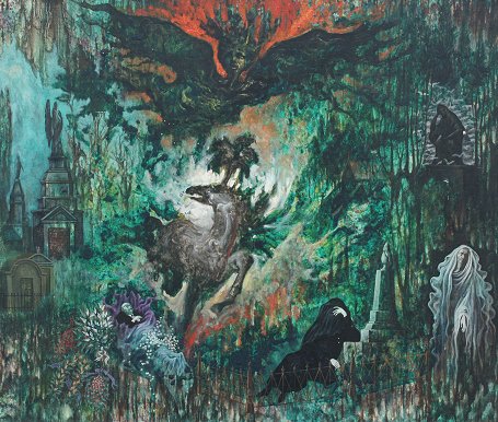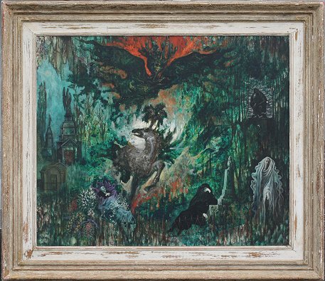 LARGE SURREAL PAINTING OF A NEW ORLEANS GRAVEYARD: OIL/B, no visible signature, 30'' x 36'', framed 40'' x 46''.