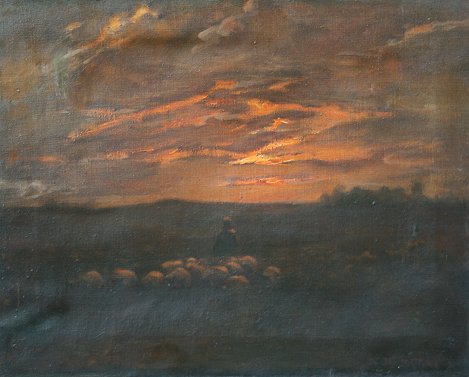 GRAY, John, (British, 20th C.): Shepherd with Flock at Sunset, OIL/C, 16'' x 20'', signed, unframed. Several tears, needs repair and cleaning.