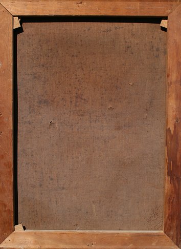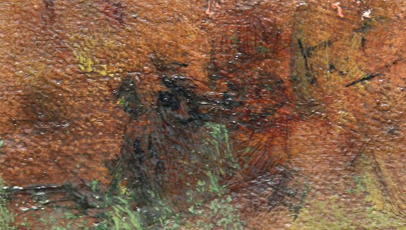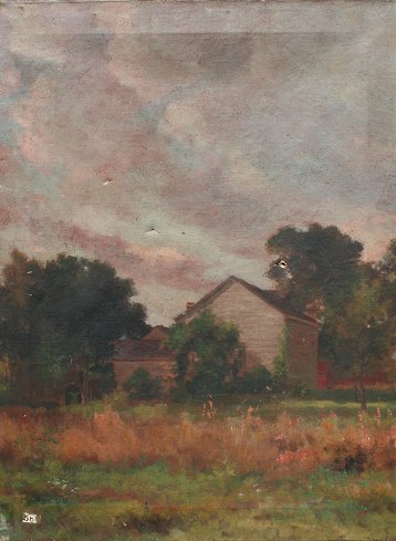 ILLEGIBLY SIGNED IMPRESSIONIST LANDSCAPE WITH BARN: Oil/C, 24'' x 18'', unframed, exhibition sticker number 58 lower left. Several punctures needs cleaning and repair.