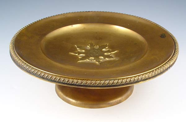 TIFFANY & CO. CAST BRONZE COMPOTE: Marked Tiffany & Co. Union Square compote or cake stand. Rope edge and monogrammed medallion. Measures 4'' high x 12'' dia. Please note isolated spots of discoloration.