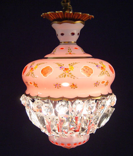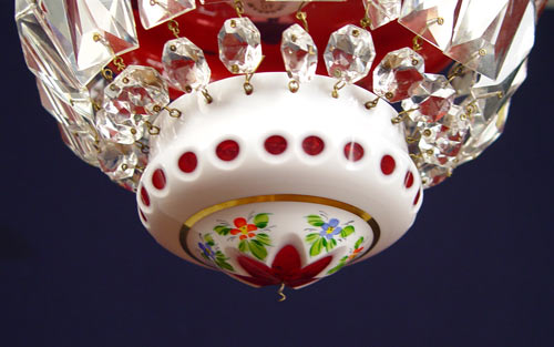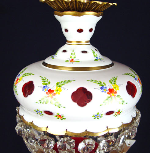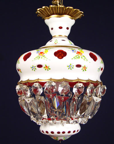 CRANBERRY OVERLAY HALL LAMP: White cut to cranberry Bohemian glass hanging light. Enameled floral decoration. Two parts joined by crystal prisms. Approx. 12''h. x 11'' dia.