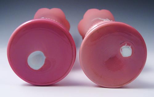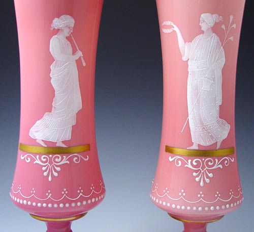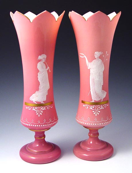 PAIR VICTORIAN ENAMELED ART GLASS VASES: Pink glass with finely detailed enameled images, 13 1/2'' H.