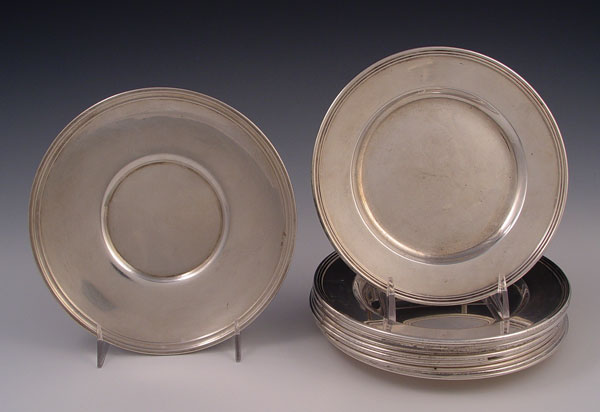 12 INTERNATIONAL STERLING DESSERT PLATES : To include 11 International Sterling dishes in the Lara Saybrook pattern. Measure 6'' in dia. Also includes 1 Redlich & Co. dish, measures 6 1/4'' dia. Approx. 38.2 troy oz.