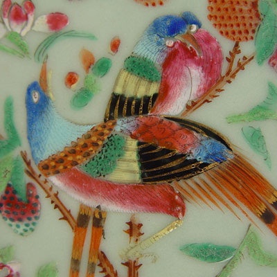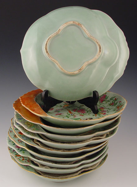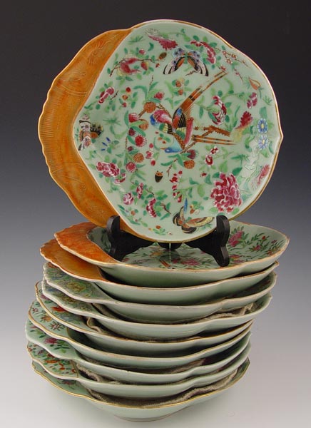 10 CHINESE FAMILLE VERTE CELADON SHRIMP PLATES: To include 3 with red handles. plates measures 10 1/2''. Please note some gold loss, no cracks or chips.