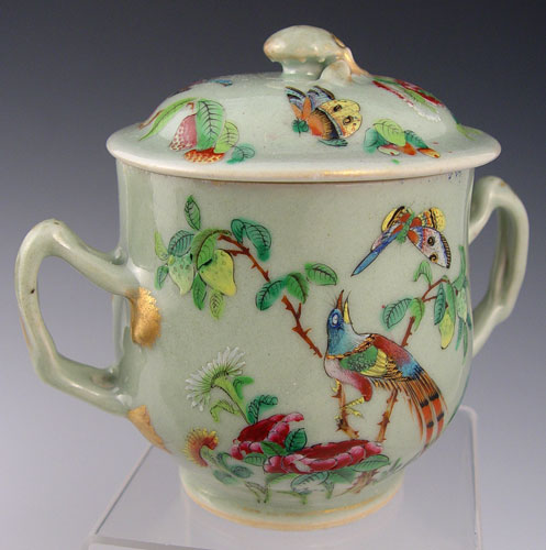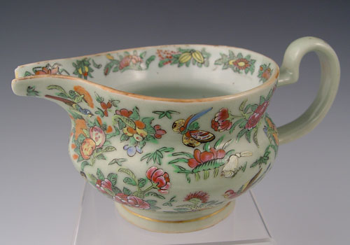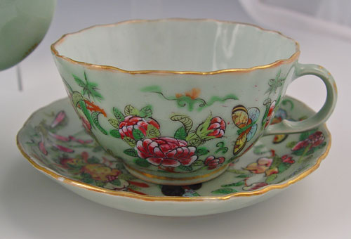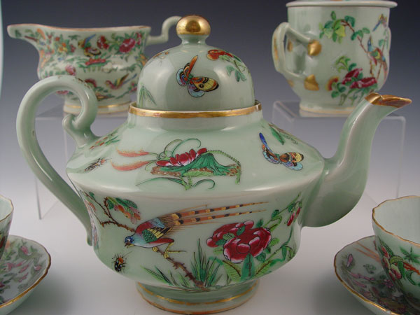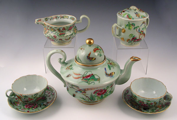 CHINESE FAMILLE VERTE CELADON TEA SET: Celadon teapot, creamer & sugar, 2 cups & saucers. 6 of many pieces of celadon in this auction.