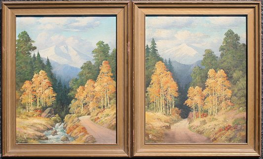 PAGE, Willard, (American, 20th C.): Pair Western Landscapes, ''Pike's Peak'', and ''Mt. Yypsilon'', OIL/CB, 14'' x 11'', monogrammed, framed, 16 1/2'' x 13 1/2'', titled verso.