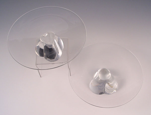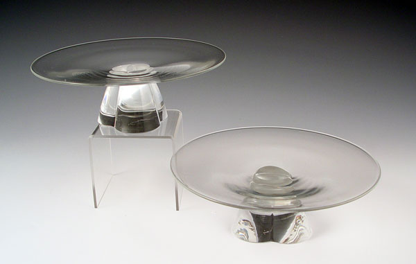 PAIR STEUBEN GLASS COMPOTES: Clear glass. Signed Stueben on base. Measures 2 5/8'' high x 7 1/4'' dia.