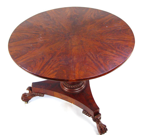 EXCEPTIONAL FLAME GRAIN MAHOGANY TILT TOP TABLE: Early to mid 19th C. Wedge shaped veneer top, claw feet on castors. Measures 29 1/2'' high x 37'' dia. Please note several chips in veneer on base, triangular shaped repair to veneer in top.