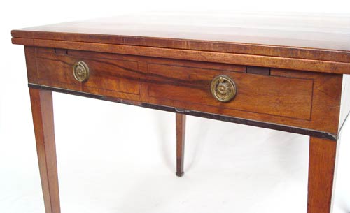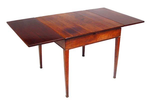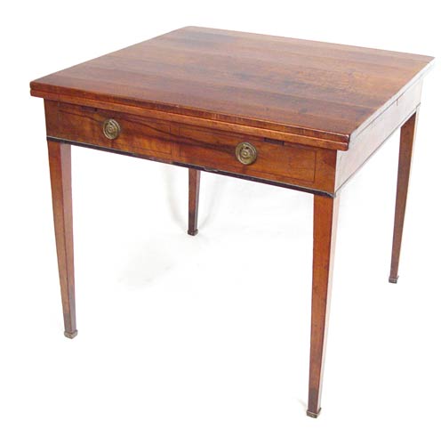 19TH C WALNUT DRAW LEAF TABLE: Hidden self store leaves, single drawer, nicely tapered legs with brass caps. 29 3/4''h. x 29 3/4'' x 31''. With leaves extended the table is 57 1/4'' long.