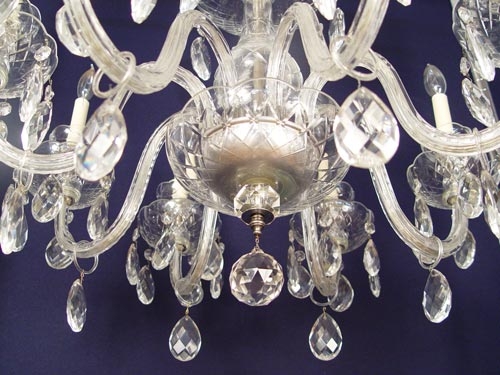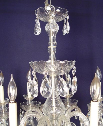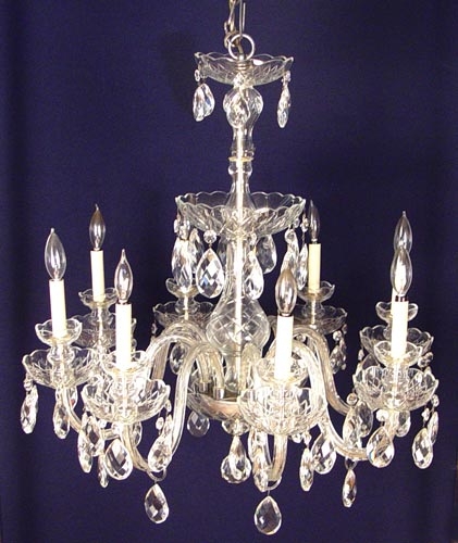 ELEGANT 8 LIGHT CRYSTAL CHANDELIER: Dripping with three tiers of faceted pear shaped prisms. Approx. 24'' tall x 26'' dia.