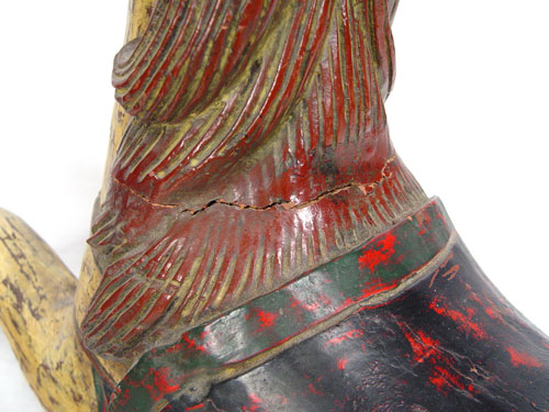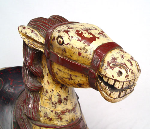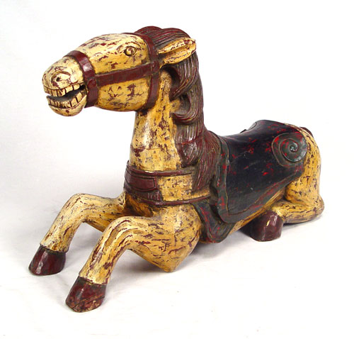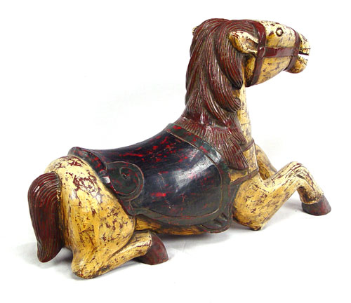 NOVELTY CARVED AND PAINTED WOOD HORSE: Heavy decorative horse, suitable for a child to rest on. 31'' long, 20 1/2''h.