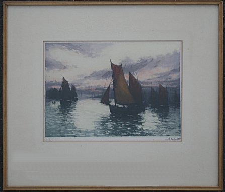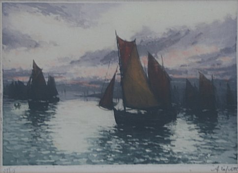 LAFITTE, Alphonse, (pseudonym for Manuel Robbe), (French, 19/20th C.): Harbor Scene at Dusk, Aquatint, 9 1/8'' x 13'' sight size, pencil signed and numbered illegibly, 17 1/2'' x 20 1/2'' in a Courvoisier frame. Not examined out of frame.