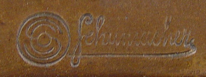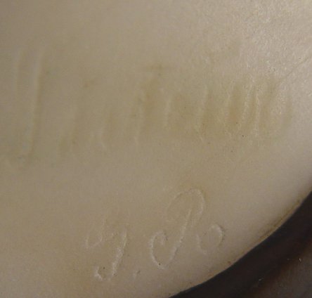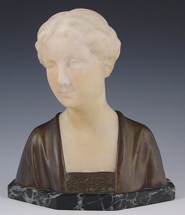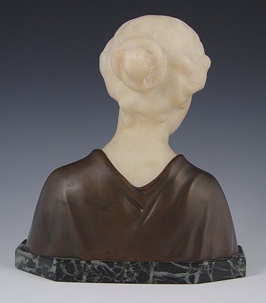 SCHUMACHER ALABASTER/BRONZE BUST: 8'' h., 7'' wide, monogrammed verso G.R., illegibly titled, Schumacher signature, seal on base.