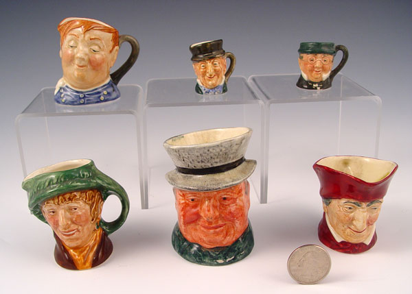 COLLECTION OF 6 MINIATURE TOBY JUGS: To include 5 Royal Doulton, Mr. Micawber 1 1/2'', Mr Pickwick 1 3/8'', Fat Boy 2 1/2'', Cardinal 2 1/4'', Arriel 2 1/2''. Also includes Lancaster Tony Weller 3''. No chips or cracks.