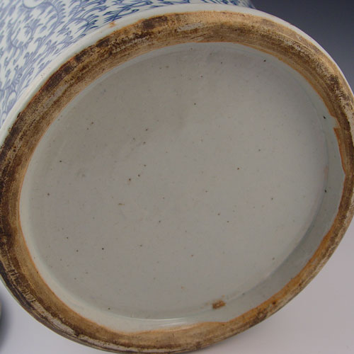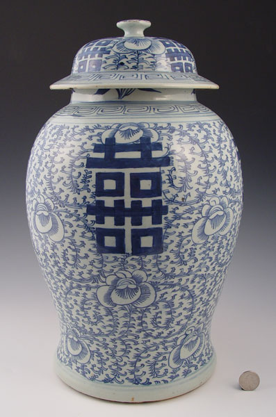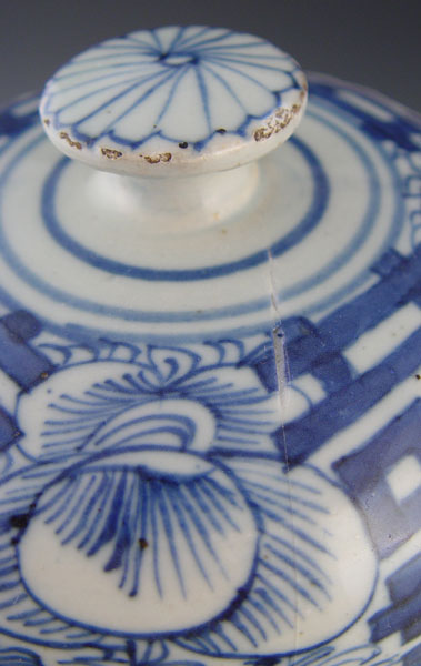 CHINESE BLUE & WHITE COVERED JAR: No identifying marks. Measures 17 3/4'' high x 9 1/2'' wide. Note under rim chips, deep scratch on lid, chips on handle.