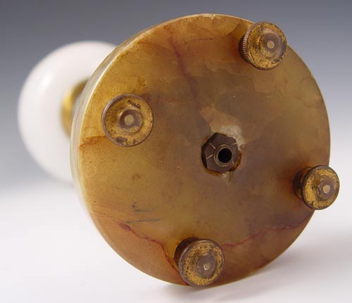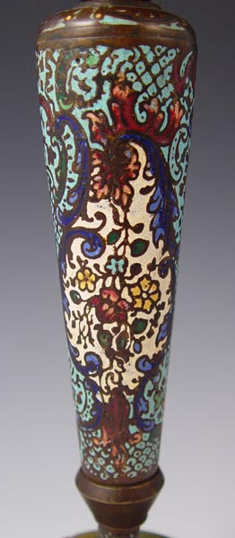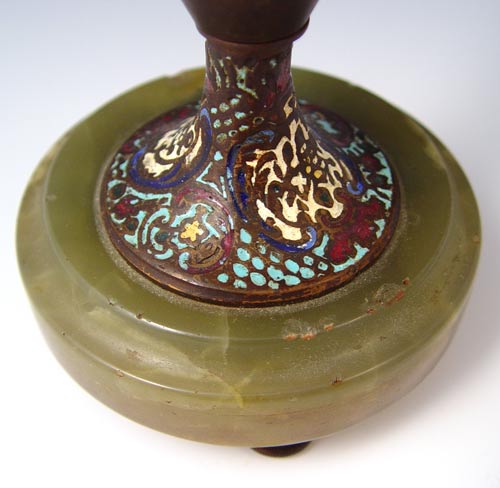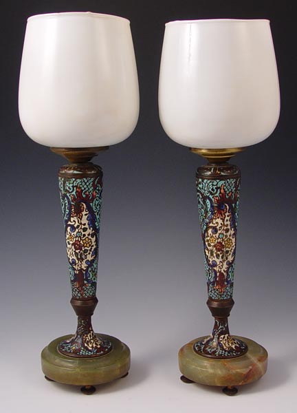 PAIR VIENNESE ENAMEL LAMPS: White glass shades over an enameled bronze candle stick stem, onyx base. There is no wiring or hardware for electricity. 15 3/4''h.